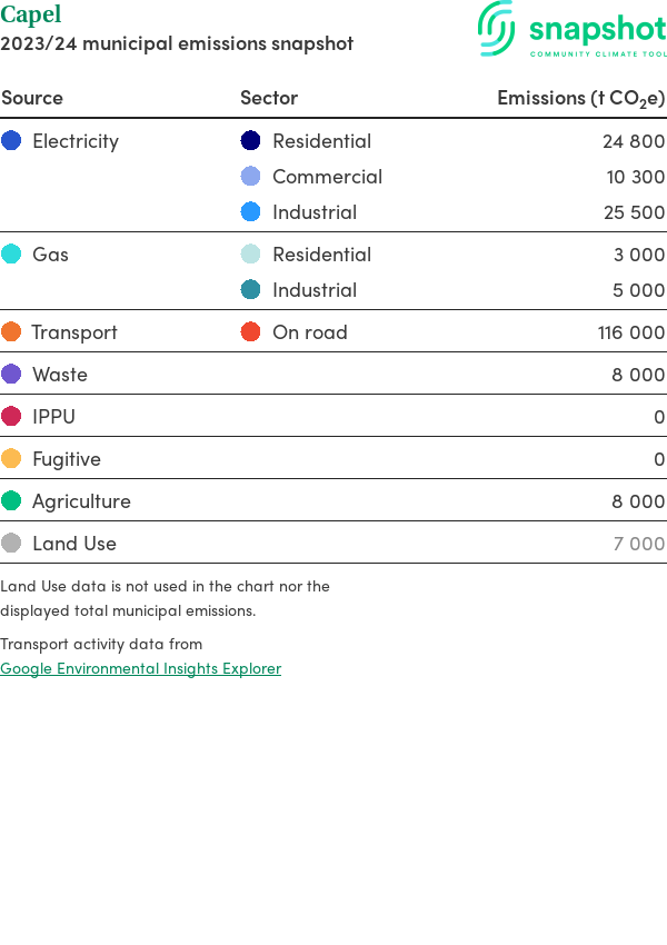 This report outlines the major sources of carbon emissions for the entire region (municipality, electorate, or state). Due to the approximate nature of the profile, the emission values are represented as rounded numbers. This report includes the following sources:
