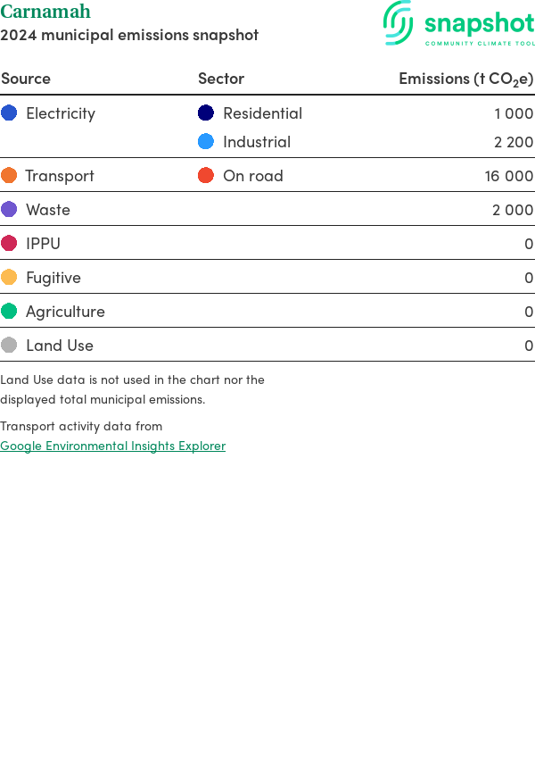 This report outlines the major sources of carbon emissions for the entire region (municipality, electorate, or state). Due to the approximate nature of the profile, the emission values are represented as rounded numbers. This report includes the following sources: