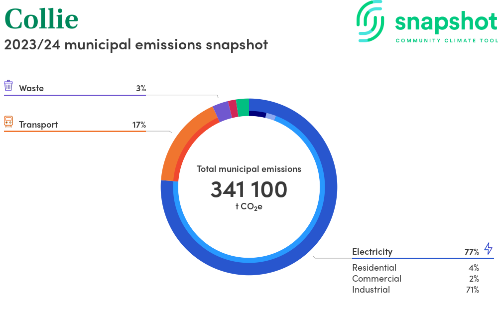 Collie is a rural municipality that is geographically small relative to the state average and has a moderate urban density. Its major emissions source is electricity consumption with the majority of this coming from industrial electricity consumption.