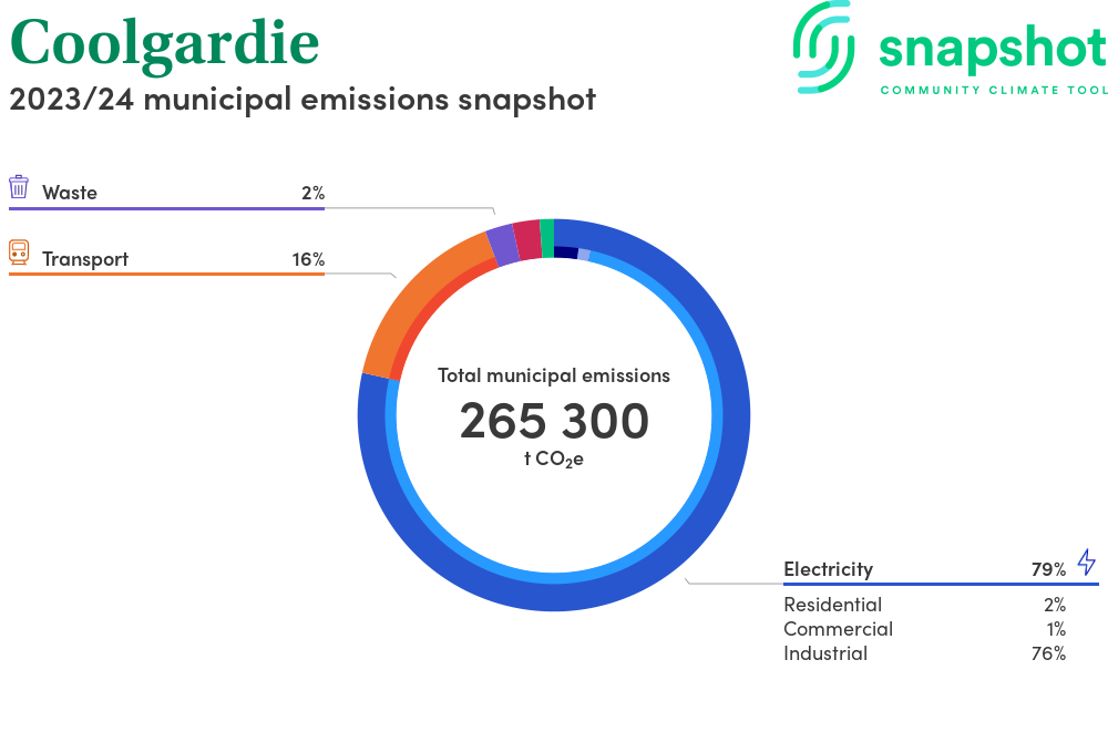 Coolgardie is a rural municipality that is large in geographical area relative to the state average and has a low urban density. Its major emissions source is electricity consumption with the majority of this coming from industrial electricity consumption.