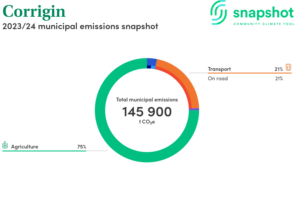 Corrigin is a rural municipality that is moderate in size relative to the state average and has a low urban density. Its major emissions source is agriculture, due to the community’s relatively large amount of agricultural activity and low population. The second largest source of emissions is on road transportation.