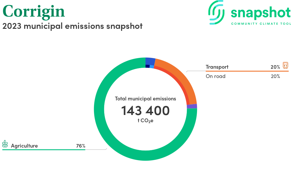 Corrigin is a rural municipality that is moderate in size relative to the state average and has a low urban density. Its major emissions source is agriculture, due to the community’s relatively large amount of agricultural activity and low population. The second largest source of emissions is on road transportation.