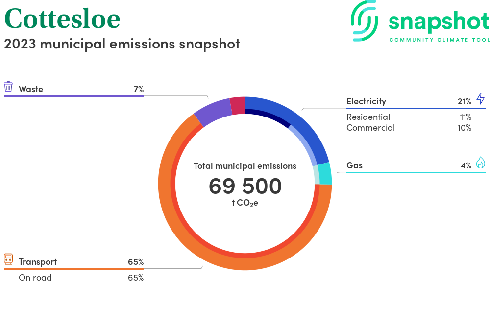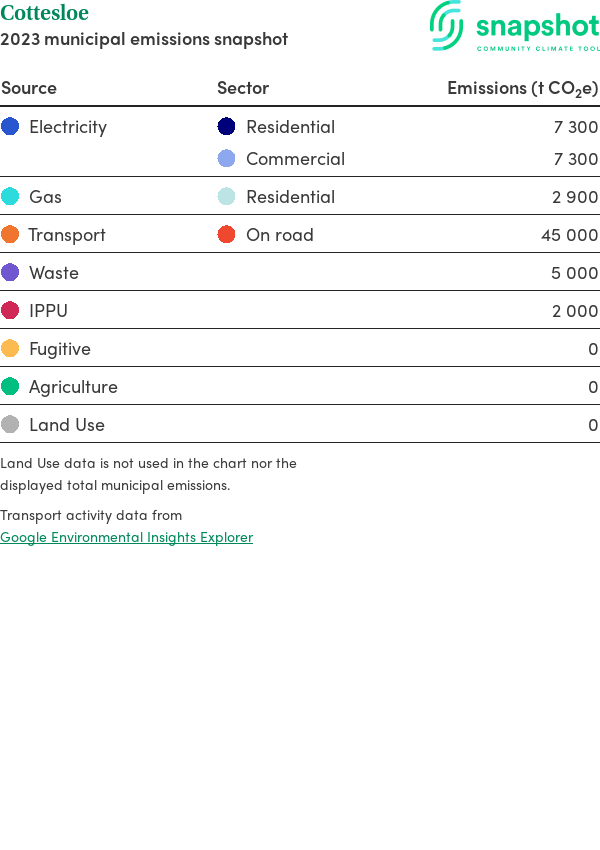 Cottesloe is a town that is geographically very small relative to the state average and has a very high urban density. Its major emissions source is on road transportation, due to the community’s larger commuting and other travel requirements. The second largest source of emissions is electricity consumption.