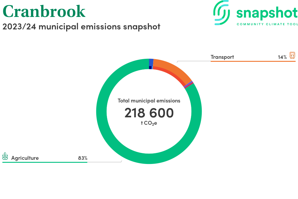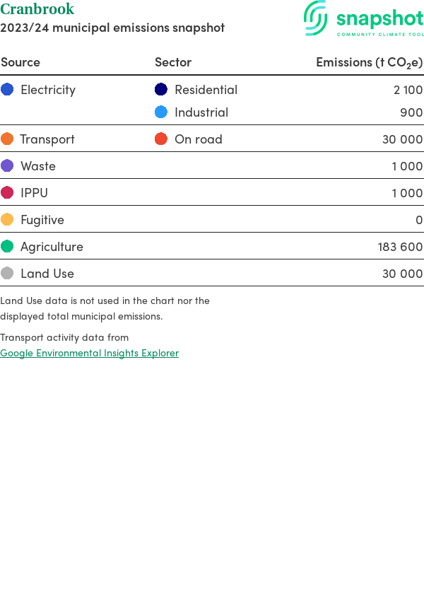 Cranbrook is a rural municipality that is moderate in size relative to the state average and has a low urban density. Its major emissions source is agriculture, due to the community’s relatively large amount of agricultural activity and low population. The second largest source of emissions is land use change.