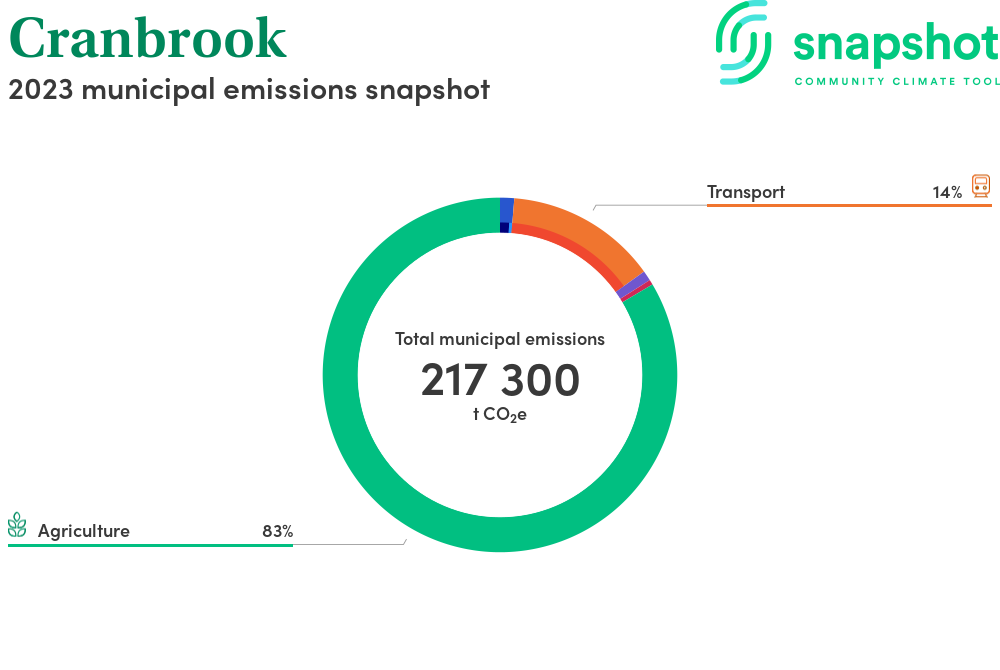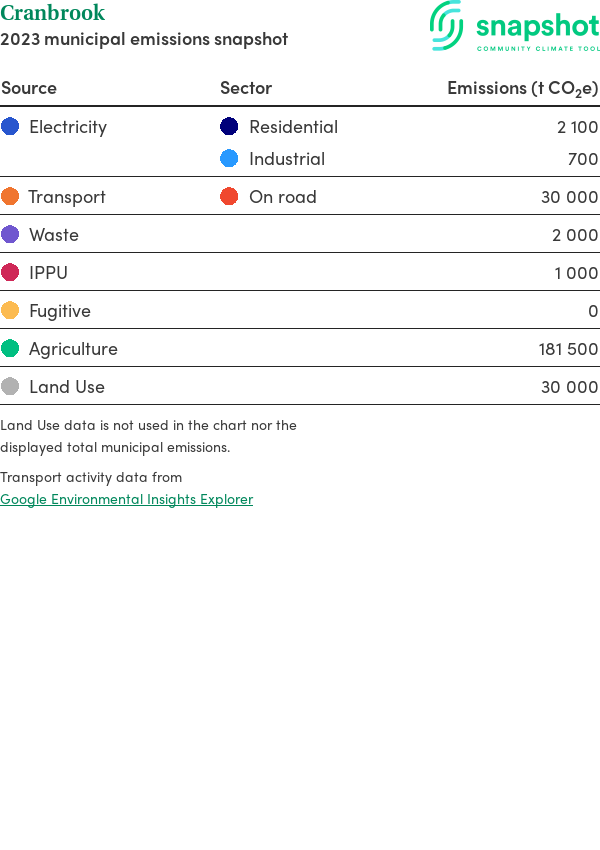 Cranbrook is a rural municipality that is moderate in size relative to the state average and has a low urban density. Its major emissions source is agriculture, due to the community’s relatively large amount of agricultural activity and low population. The second largest source of emissions is land use change.