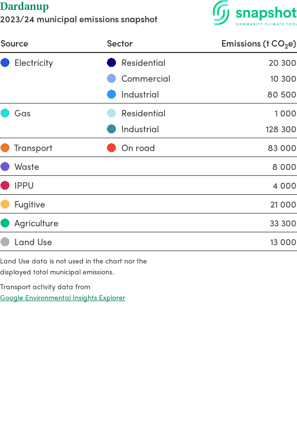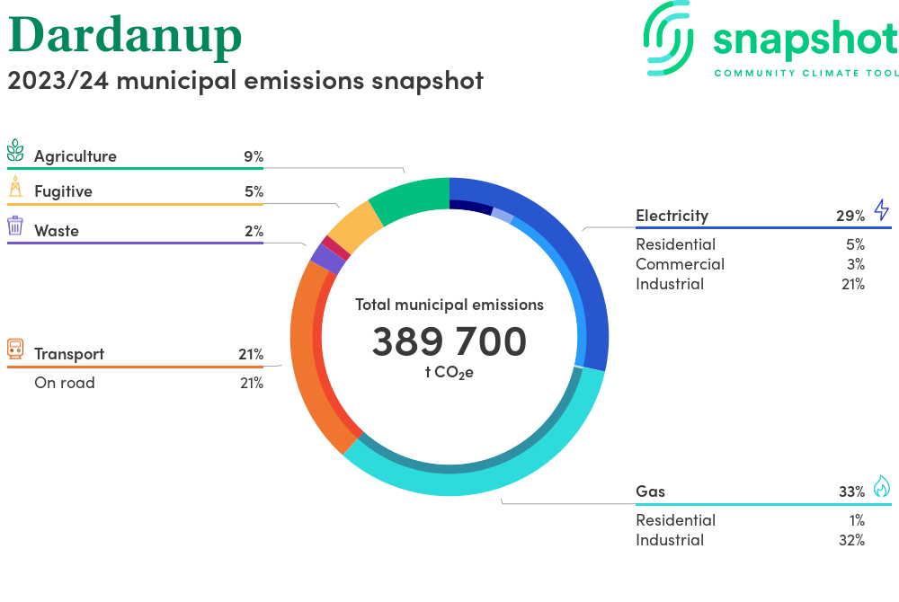 Dardanup is a rural municipality that is geographically small relative to the state average and has a high urban density. Its major emissions source is gas consumption, due to the community’s relatively large population and commercial activity. The second largest source of emissions is industrial gas consumption.