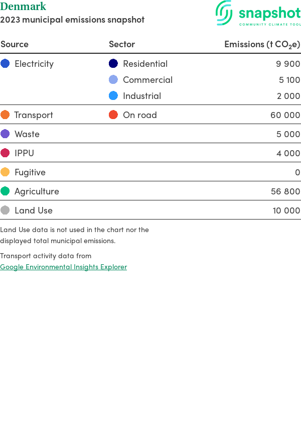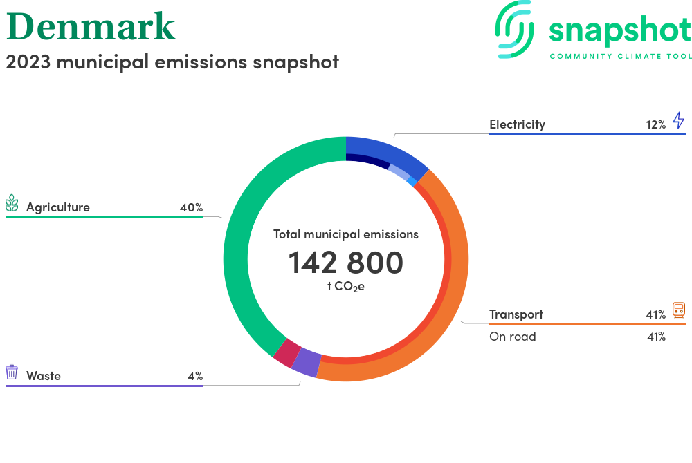 Denmark is a rural municipality that is geographically small relative to the state average and has a moderate urban density. Its major emissions source is agriculture, due to the community’s relatively large amount of agricultural activity and low population. The second largest source of emissions is on road transportation.