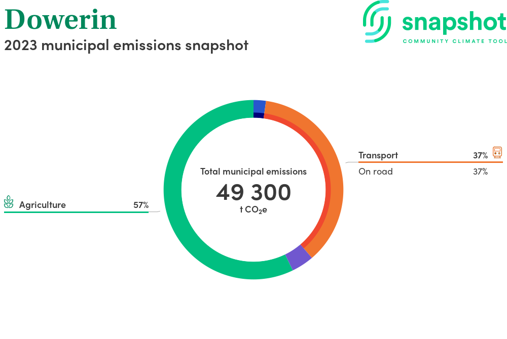 Dowerin is a rural municipality that is geographically small relative to the state average and has a low urban density. Its major emissions source is agriculture, due to the community’s relatively large amount of agricultural activity and low population. The second largest source of emissions is on road transportation.