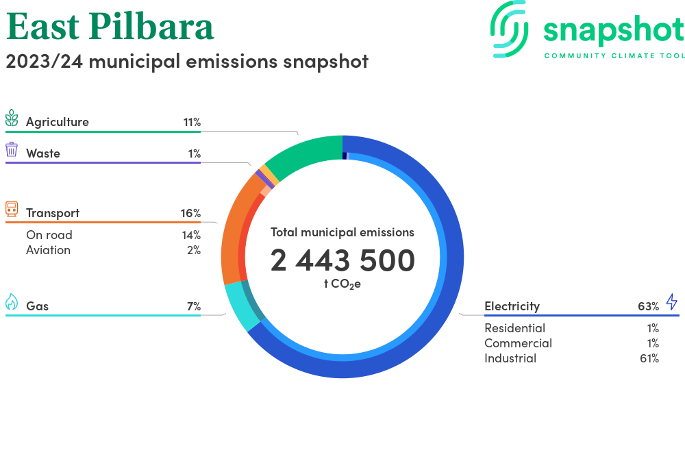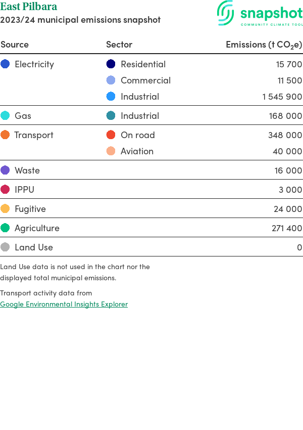 East Pilbara is a rural municipality that is very large in geographical area relative to the state average and has a very low urban density. Its major emissions source is electricity consumption with the majority of this coming from industrial electricity consumption.