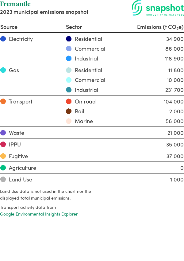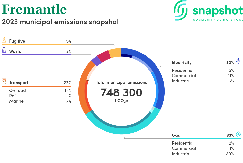 Fremantle is a city that is geographically very small relative to the state average and has a very high urban density. Its major emissions source is gas consumption, due to the community’s relatively large population and commercial activity. The second largest source of emissions is industrial gas consumption.