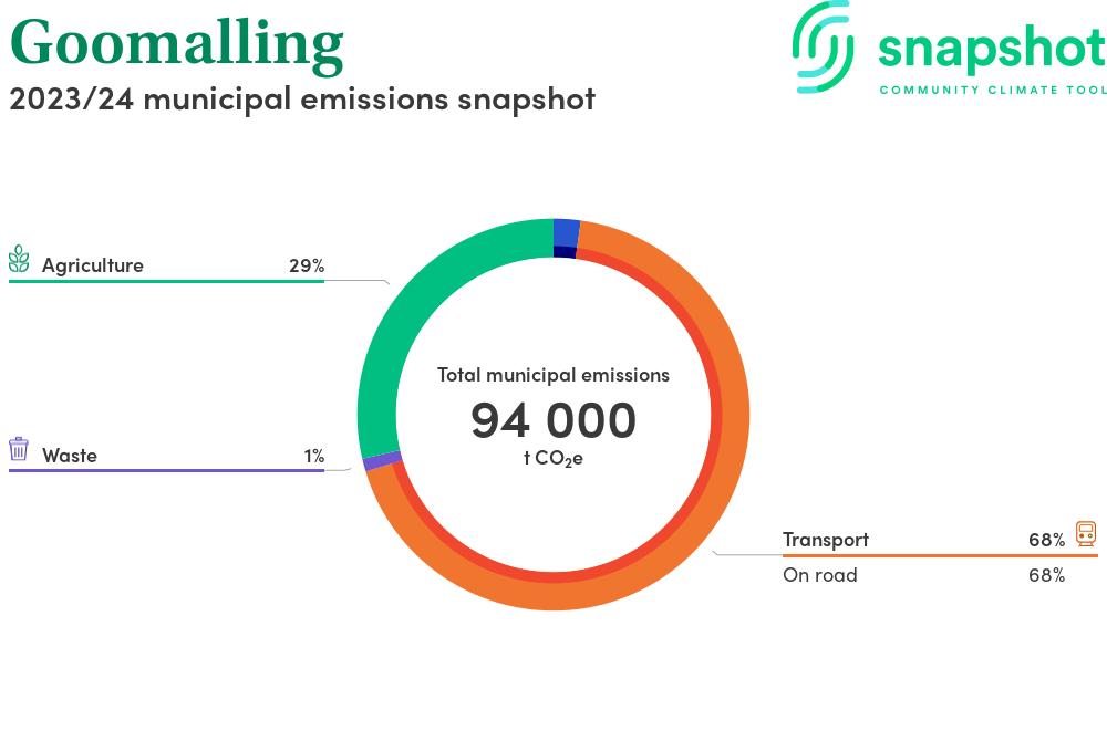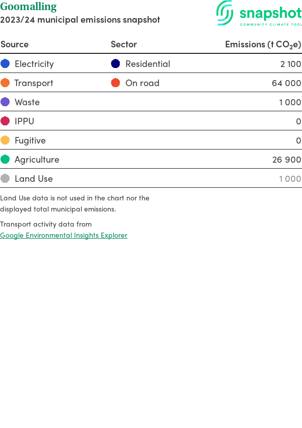 Goomalling is a rural municipality that is geographically small relative to the state average and has a low urban density. Its major emissions source is on road transportation, due to the community’s larger commuting and other travel requirements. The second largest source of emissions is agriculture.