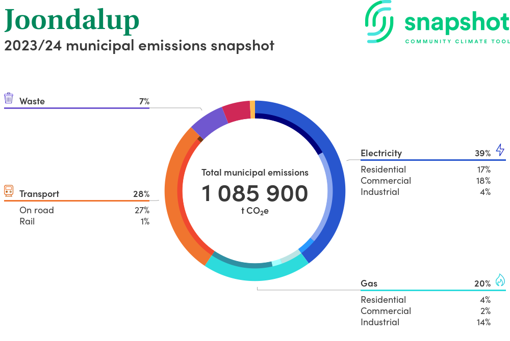 Joondalup is a city that is geographically small relative to the state average and has a very high urban density. Its major emissions source is electricity consumption, due to the community’s scale of population and commercial activity. The second largest source of emissions is on road transportation.