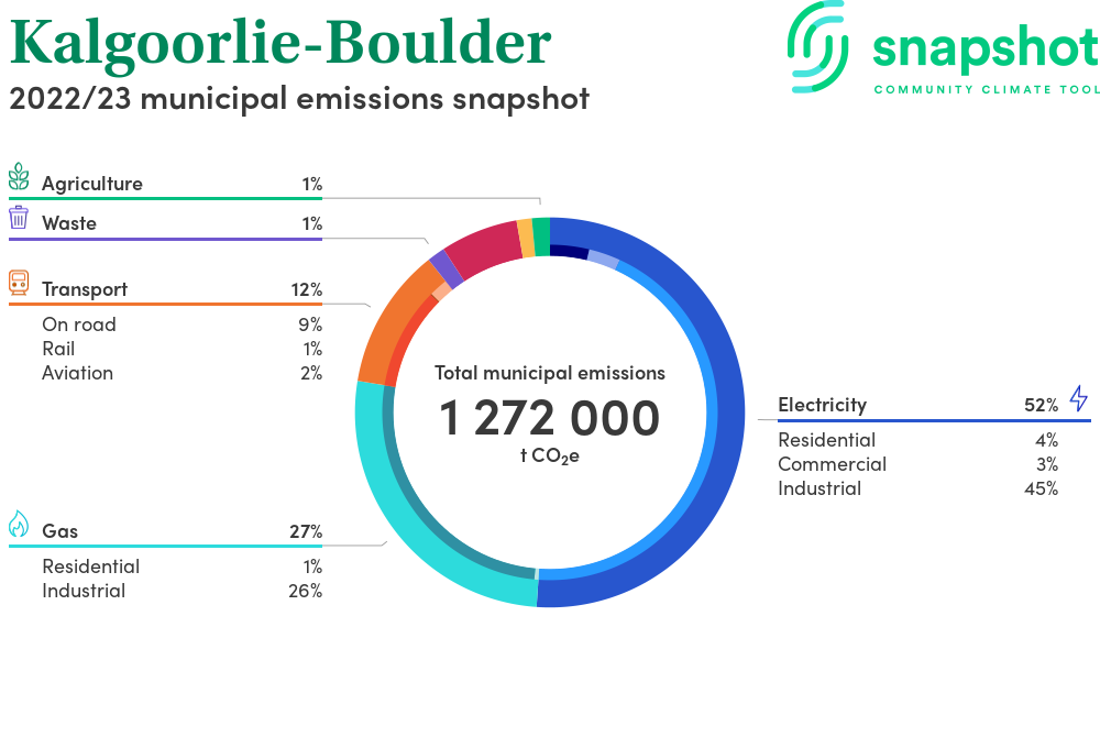Kalgoorlie-Boulder is a city that is very large in geographical area relative to the state average and has a low urban density. Its major emissions source is electricity consumption with the majority of this coming from industrial electricity consumption.