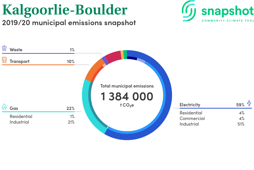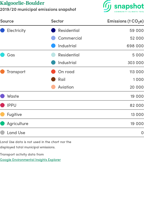 Kalgoorlie-Boulder is a city that is very large in geographical area relative to the state average and has a low urban density. Its major emissions source is electricity consumption with the majority of this coming from industrial electricity consumption.