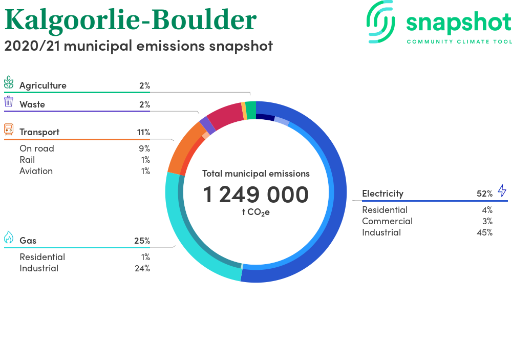 Kalgoorlie-Boulder is a city that is very large in geographical area relative to the state average and has a low urban density. Its major emissions source is electricity consumption with the majority of this coming from industrial electricity consumption.