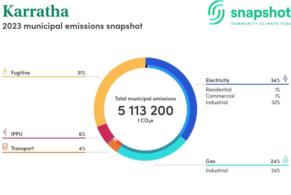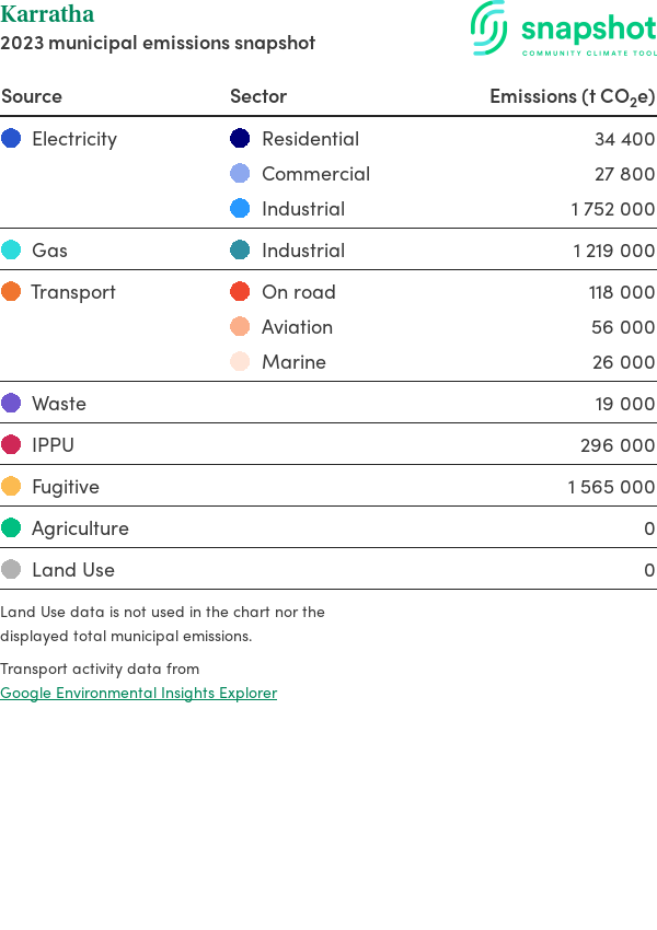 Karratha is a city that is large in geographical area relative to the state average and has a moderate urban density. Its major emissions source is electricity consumption with the majority of this coming from industrial electricity consumption.
