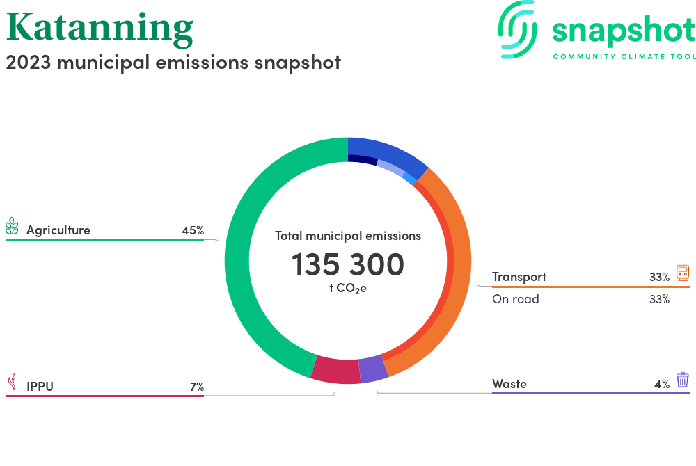 Katanning is a rural municipality that is geographically small relative to the state average and has a moderate urban density. Its major emissions source is agriculture, due to the community’s relatively large amount of agricultural activity and low population. The second largest source of emissions is on road transportation.