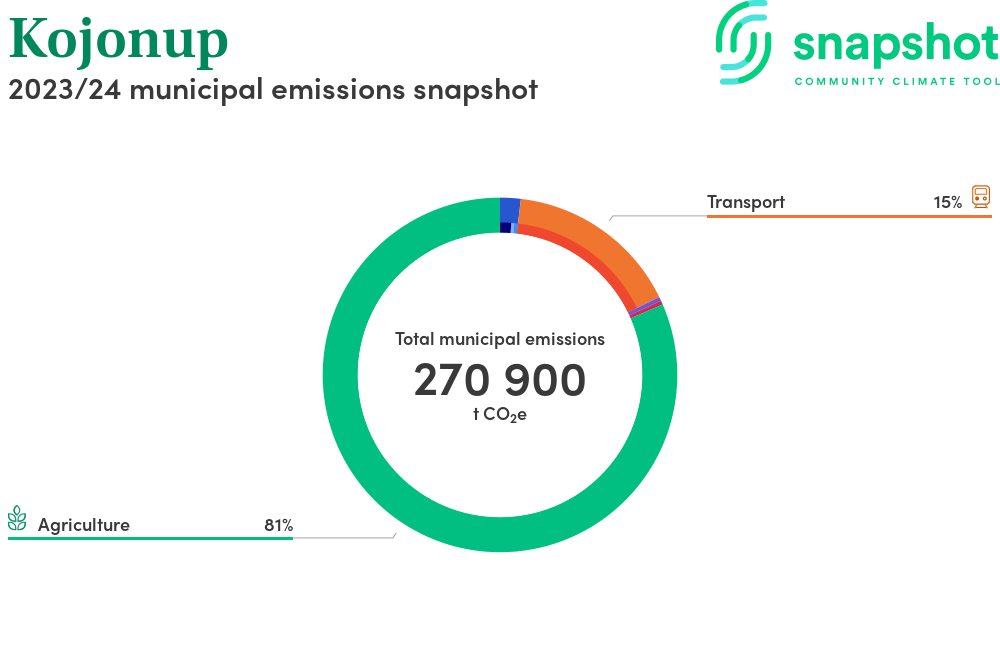 Kojonup is a rural municipality that is moderate in size relative to the state average and has a moderate urban density. Its major emissions source is agriculture, due to the community’s relatively large amount of agricultural activity and low population. The second largest source of emissions is on road transportation.