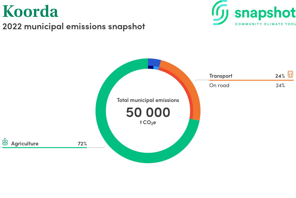 Koorda is a rural municipality that is moderate in size relative to the state average and has a low urban density. Its major emissions source is agriculture, due to the community’s relatively large amount of agricultural activity and low population. The second largest source of emissions is on road transportation.