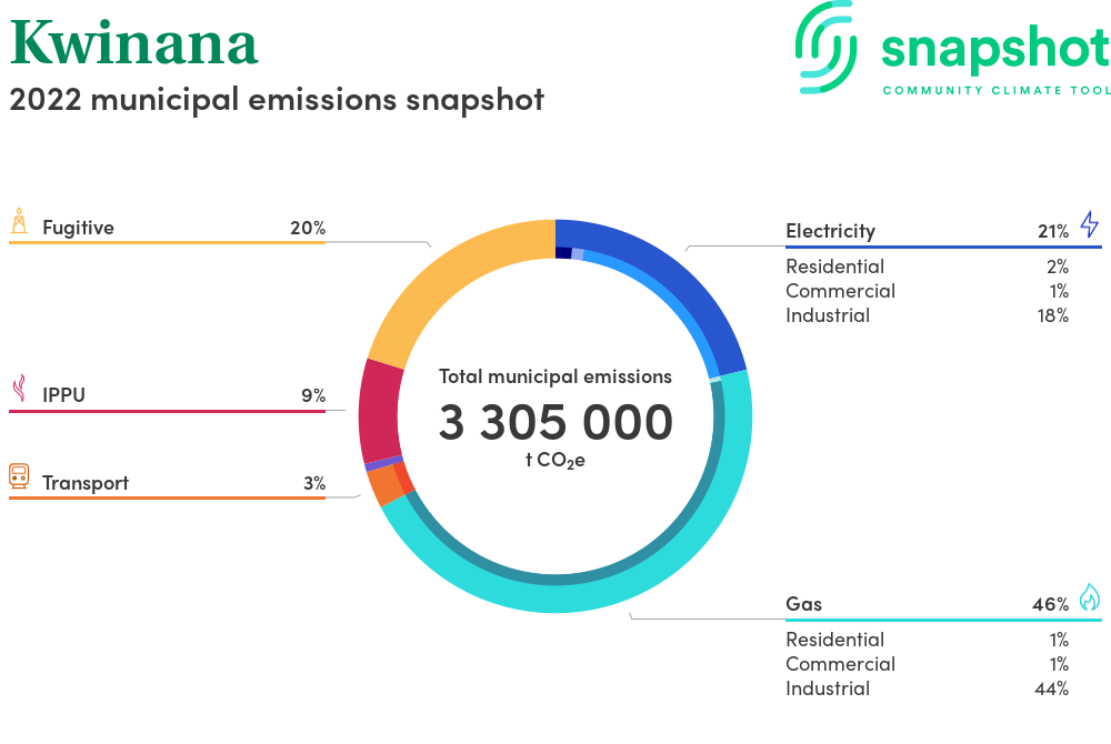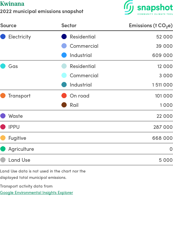 Kwinana is a city that is geographically small relative to the state average and has a high urban density. Its major emissions source is gas consumption, due to the community’s relatively large population and commercial activity. The second largest source of emissions is industrial gas consumption.
