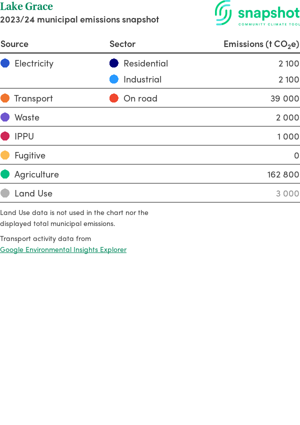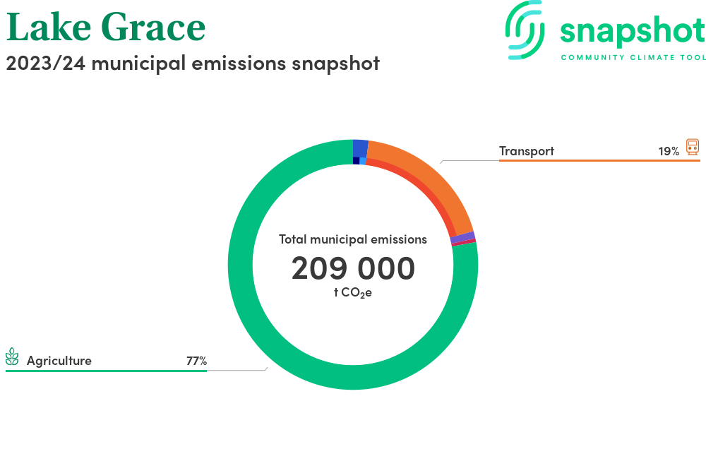 Lake Grace is a rural municipality that is large in geographical area relative to the state average and has a low urban density. Its major emissions source is agriculture, due to the community’s relatively large amount of agricultural activity and low population. The second largest source of emissions is on road transportation.