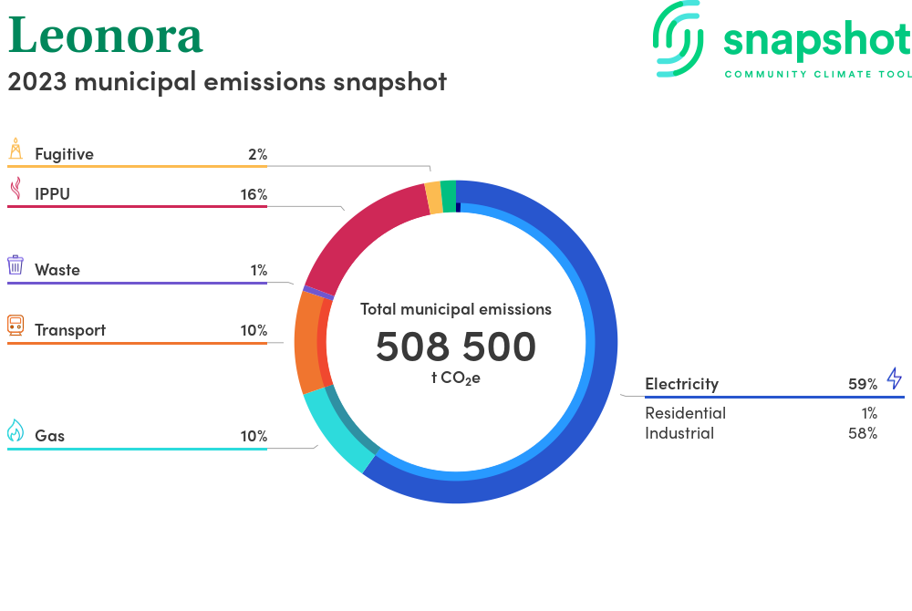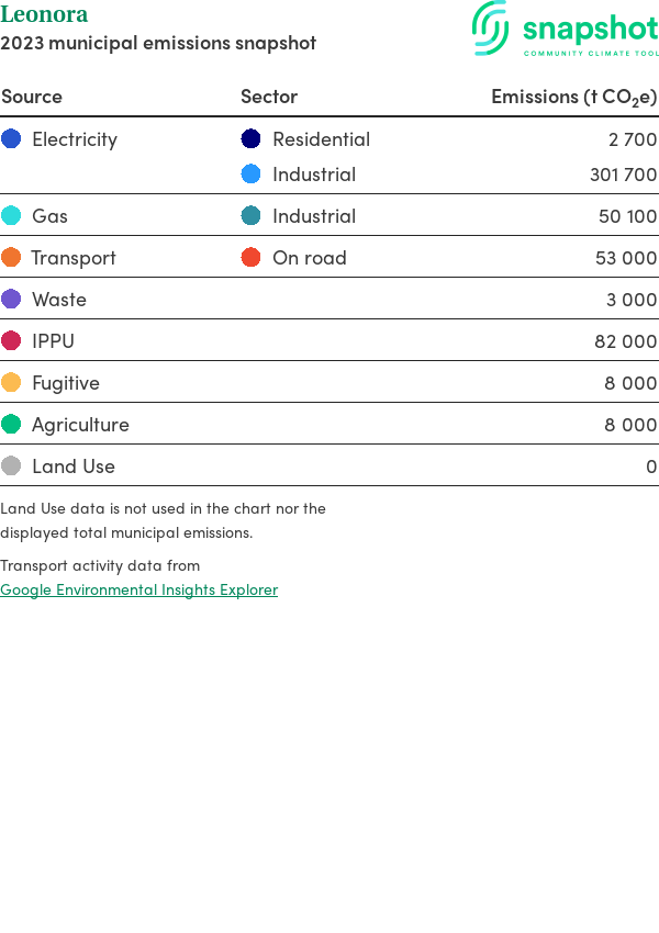 Leonora is a rural municipality that is large in geographical area relative to the state average and has a very low urban density. Its major emissions source is electricity consumption with the majority of this coming from industrial electricity consumption.