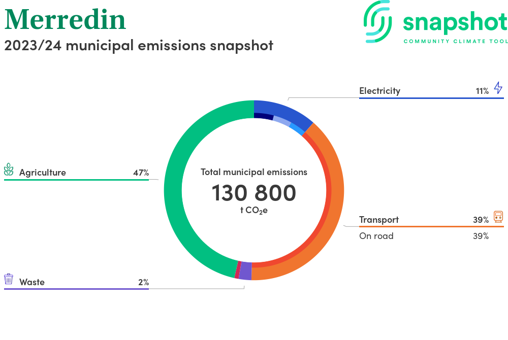 Merredin is a rural municipality that is moderate in size relative to the state average and has a moderate urban density. Its major emissions source is agriculture, due to the community’s relatively large amount of agricultural activity and low population. The second largest source of emissions is on road transportation.