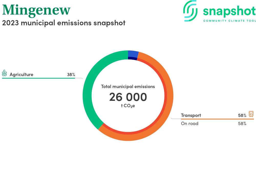 Mingenew is a rural municipality that is geographically small relative to the state average and has a low urban density. Its major emissions source is on road transportation, due to the community’s larger commuting and other travel requirements. The second largest source of emissions is agriculture.
