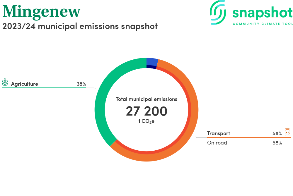 Mingenew is a rural municipality that is geographically small relative to the state average and has a low urban density. Its major emissions source is on road transportation, due to the community’s larger commuting and other travel requirements. The second largest source of emissions is agriculture.