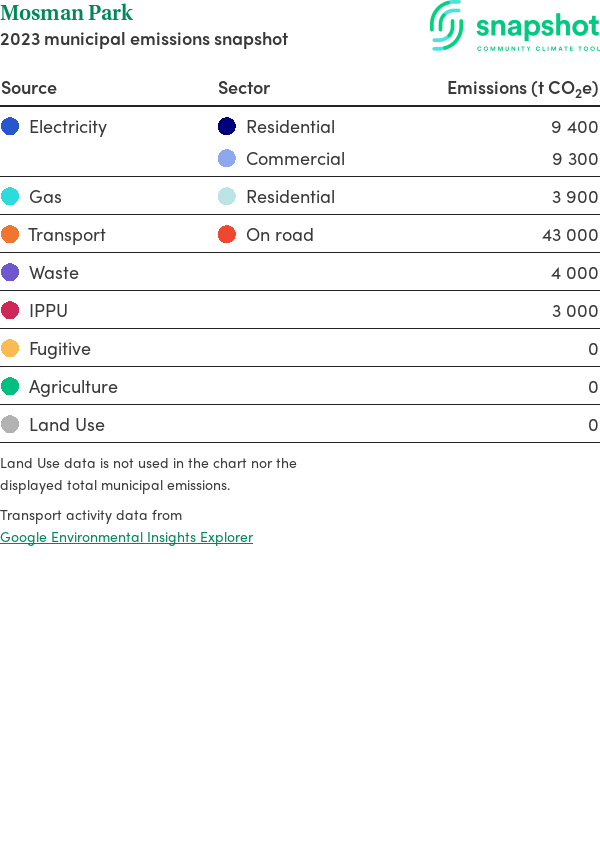 Mosman Park is a town that is geographically very small relative to the state average and has a very high urban density. Its major emissions source is on road transportation, due to the community’s larger commuting and other travel requirements. The second largest source of emissions is electricity consumption.