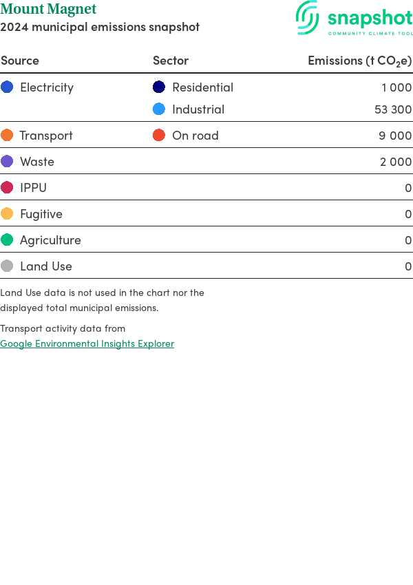 This report outlines the major sources of carbon emissions for the entire region (municipality, electorate, or state). Due to the approximate nature of the profile, the emission values are represented as rounded numbers. This report includes the following sources: