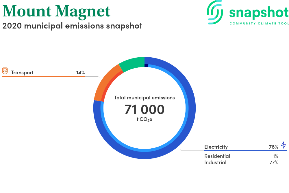 Mount Magnet is a rural municipality that is large in geographical area relative to the state average and has a very low urban density. Its major emissions source is electricity consumption with the majority of this coming from industrial electricity consumption.