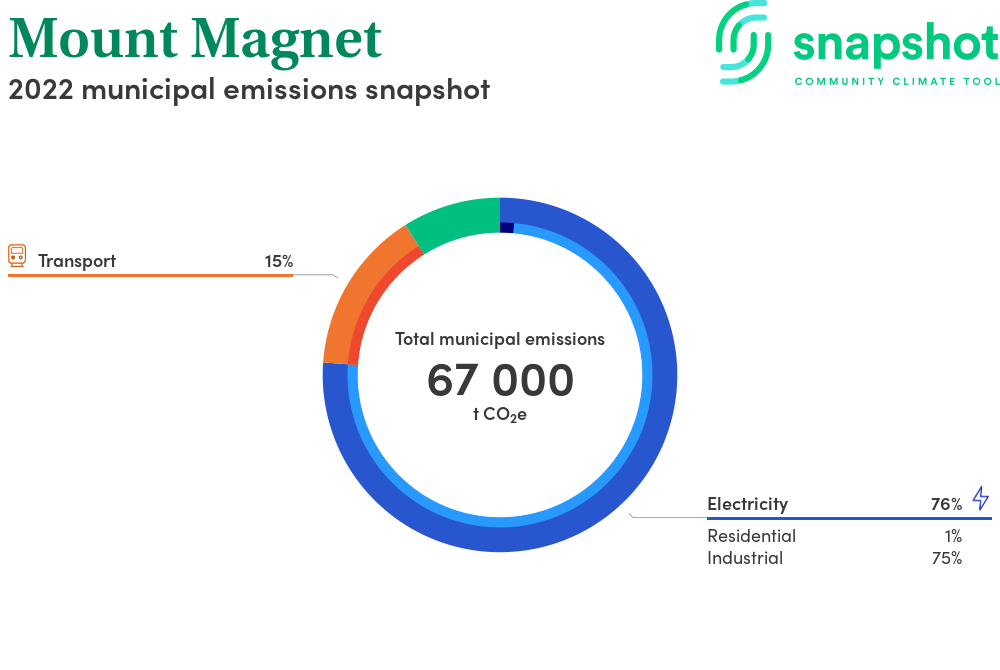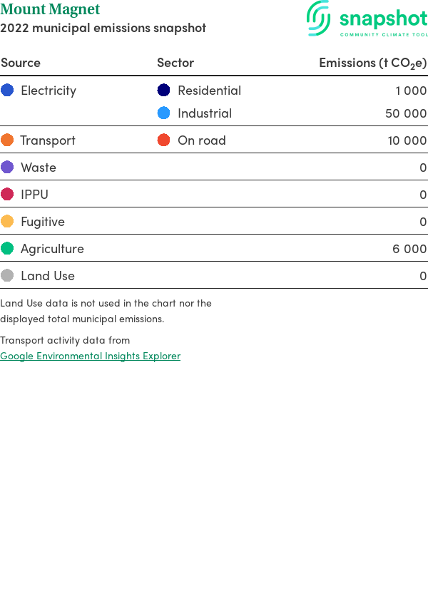 Mount Magnet is a rural municipality that is large in geographical area relative to the state average and has a very low urban density. Its major emissions source is electricity consumption with the majority of this coming from industrial electricity consumption.