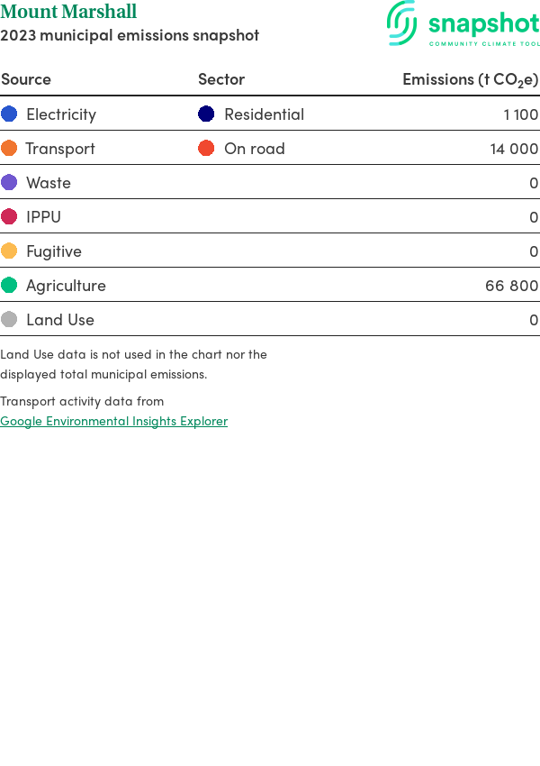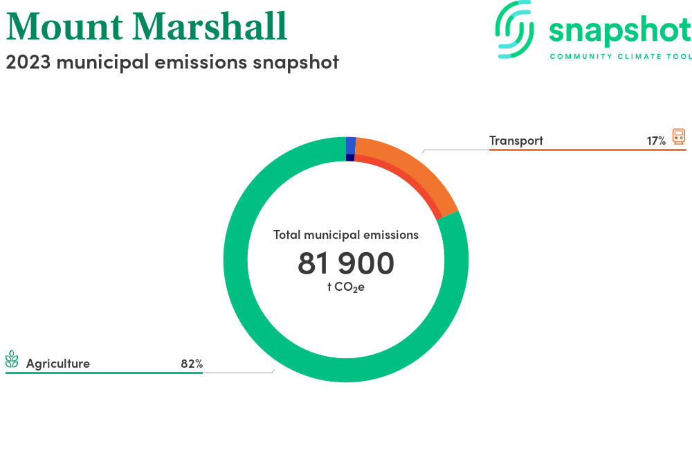 Mount Marshall is a rural municipality that is large in geographical area relative to the state average and has a very low urban density. Its major emissions source is agriculture, due to the community’s relatively large amount of agricultural activity and low population. The second largest source of emissions is on road transportation.