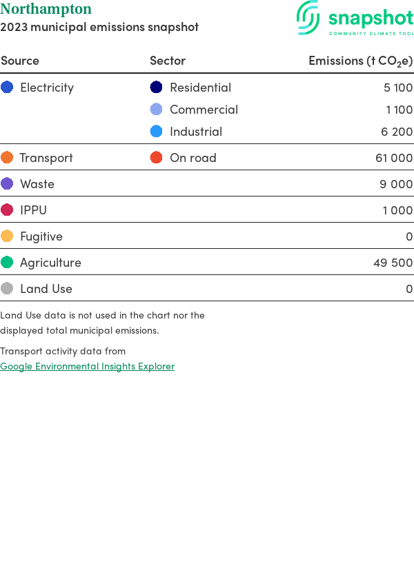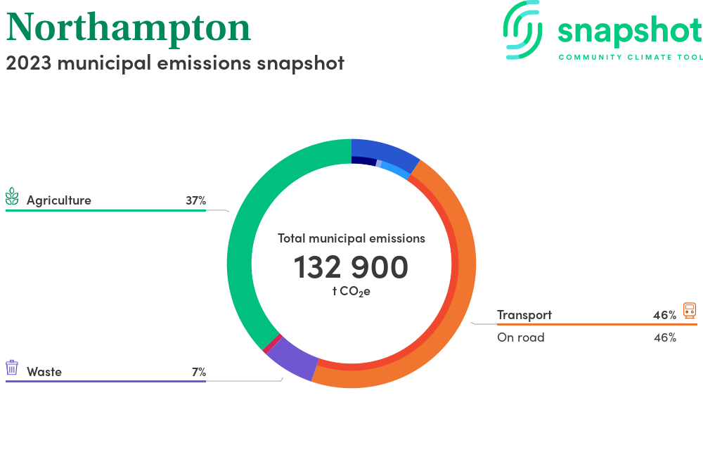 Northampton is a rural municipality that is large in geographical area relative to the state average and has a low urban density. Its major emissions source is on road transportation, due to the community’s larger commuting and other travel requirements. The second largest source of emissions is agriculture.