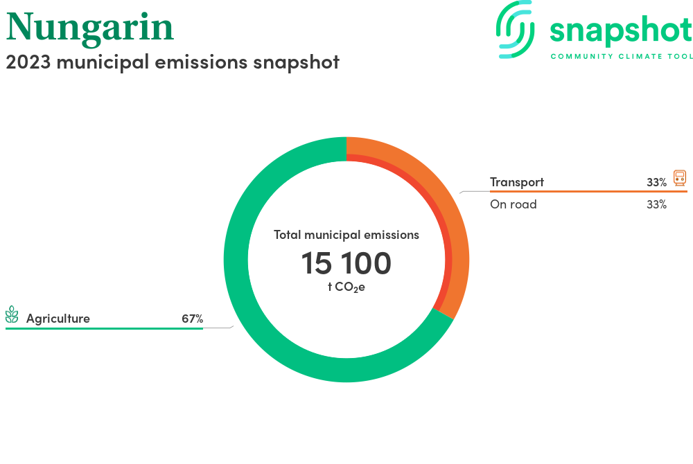 Nungarin is a rural municipality that is geographically small relative to the state average and has a low urban density. Its major emissions source is agriculture, due to the community’s relatively large amount of agricultural activity and low population. The second largest source of emissions is on road transportation.