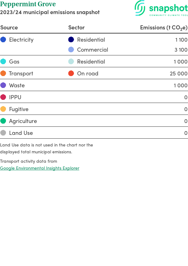 Peppermint Grove is a metro municipality that is geographically very small relative to the state average and has a high urban density. Its major emissions source is on road transportation, due to the community’s larger commuting and other travel requirements. The second largest source of emissions is electricity consumption.