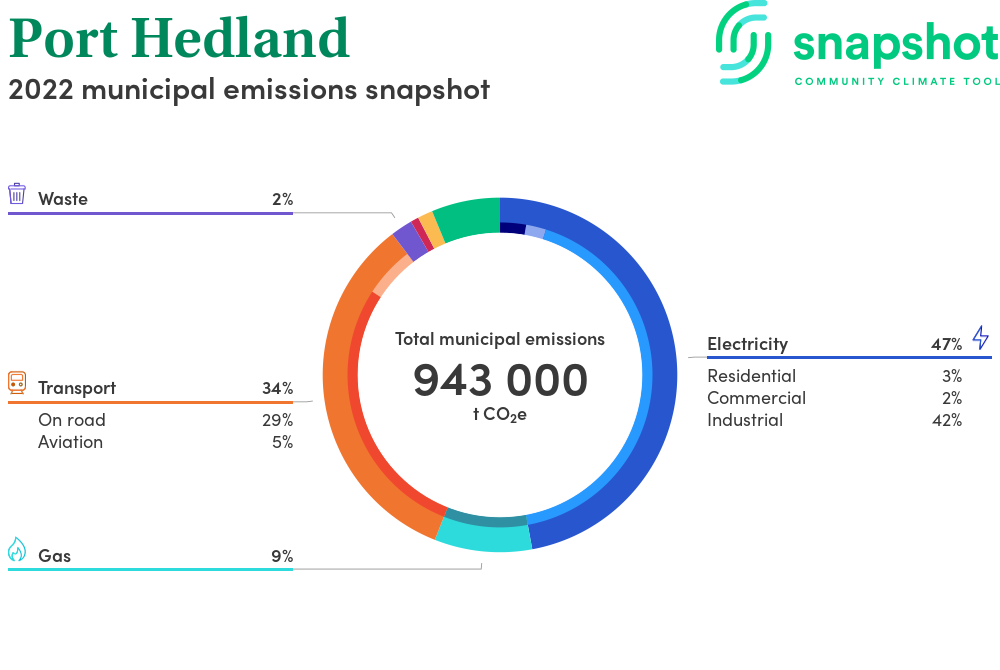 Port Hedland is a town that is large in geographical area relative to the state average and has a moderate urban density. Its major emissions source is electricity consumption with the majority of this coming from industrial electricity consumption.