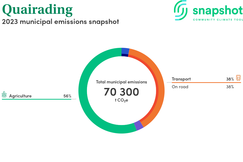 Quairading is a rural municipality that is geographically small relative to the state average and has a low urban density. Its major emissions source is agriculture, due to the community’s relatively large amount of agricultural activity and low population. The second largest source of emissions is on road transportation.