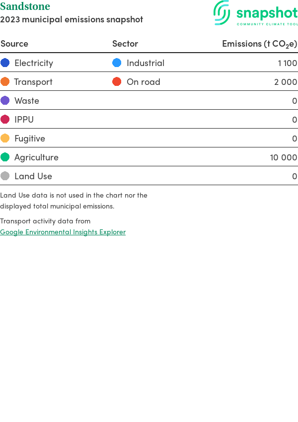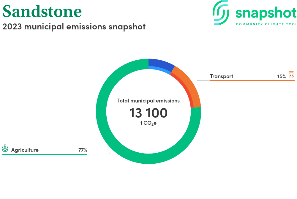 Sandstone is a rural municipality that is large in geographical area relative to the state average and has a very low urban density. Its major emissions source is agriculture, due to the community’s relatively large amount of agricultural activity and low population. The second largest source of emissions is on road transportation.