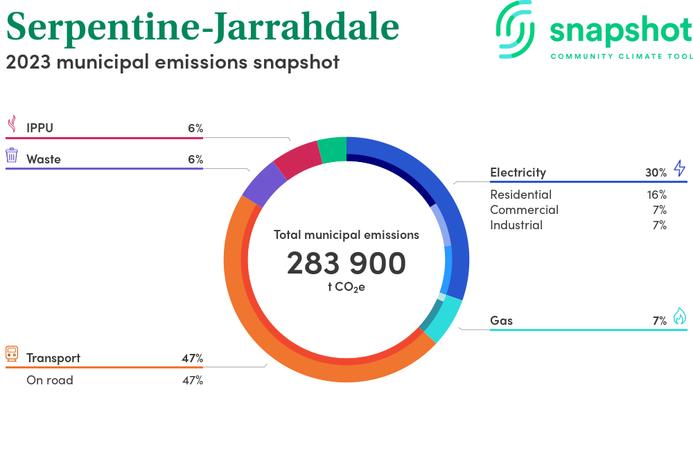 Serpentine-Jarrahdale is a rural municipality that is geographically small relative to the state average and has a high urban density. Its major emissions source is on road transportation, due to the community’s larger commuting and other travel requirements. The second largest source of emissions is electricity consumption.