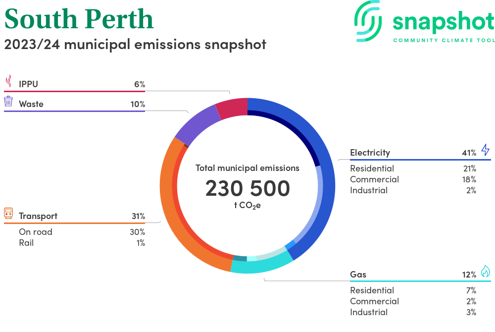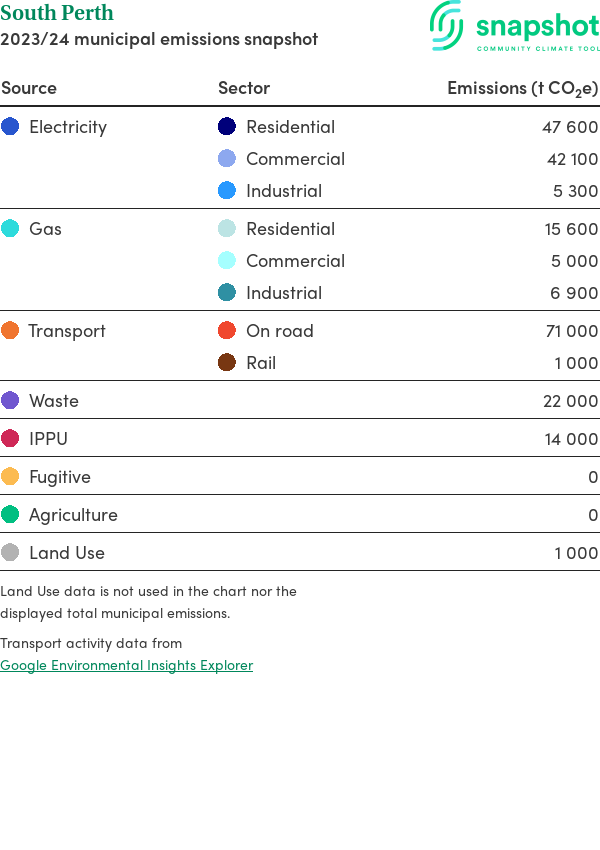 South Perth is a city that is geographically very small relative to the state average and has a very high urban density. Its major emissions source is electricity consumption, due to the community’s scale of population and commercial activity. The second largest source of emissions is on road transportation.