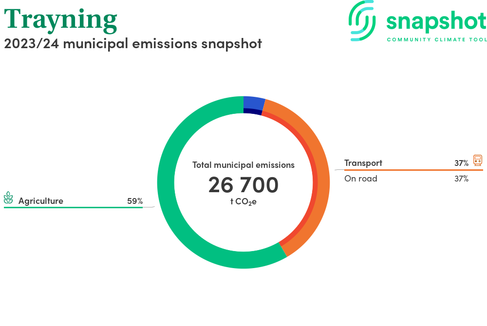 Trayning is a rural municipality that is geographically small relative to the state average and has a low urban density. Its major emissions source is agriculture, due to the community’s relatively large amount of agricultural activity and low population. The second largest source of emissions is on road transportation.