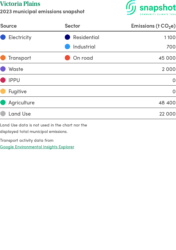 Victoria Plains is a rural municipality that is geographically small relative to the state average and has a low urban density. Its major emissions source is agriculture, due to the community’s relatively large amount of agricultural activity and low population. The second largest source of emissions is on road transportation.