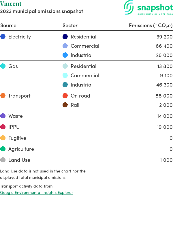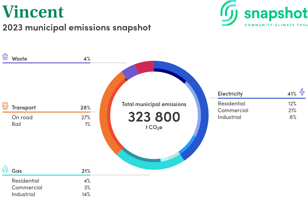 Vincent is a city that is geographically very small relative to the state average and has a very high urban density. Its major emissions source is electricity consumption, due to the community’s scale of population and commercial activity. The second largest source of emissions is gas consumption.