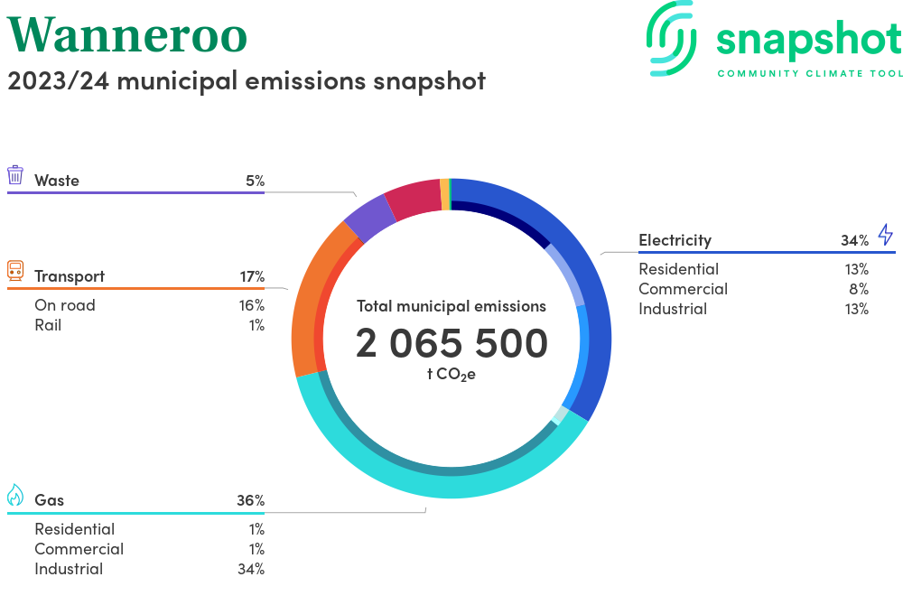 Wanneroo is a city that is geographically small relative to the state average and has a high urban density. Its major emissions source is gas consumption, due to the community’s relatively large population and commercial activity. The second largest source of emissions is industrial gas consumption.