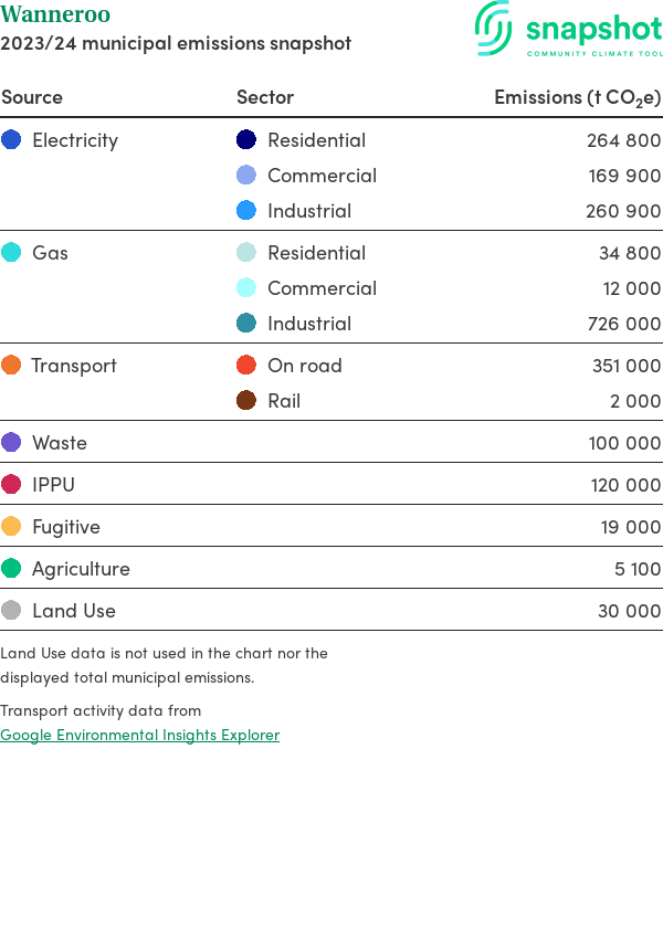 This report outlines the major sources of carbon emissions for the entire region (municipality, electorate, or state). Due to the approximate nature of the profile, the emission values are represented as rounded numbers. This report includes the following sources: