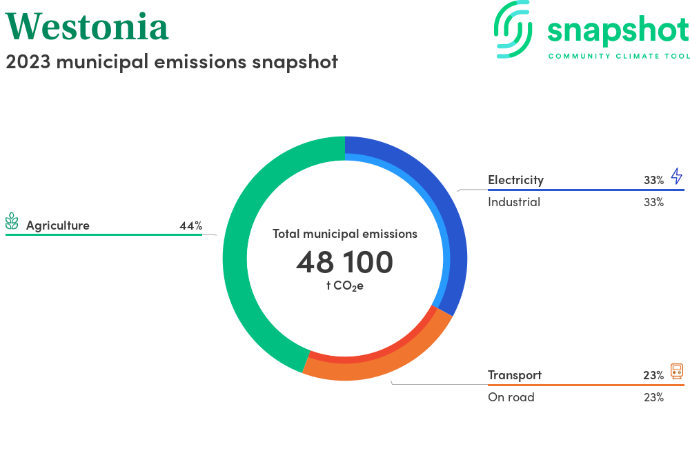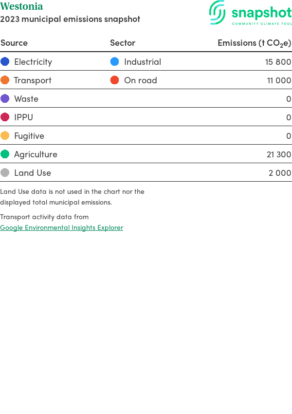 Westonia is a rural municipality that is moderate in size relative to the state average and has a low urban density. Its major emissions source is agriculture, due to the community’s relatively large amount of agricultural activity and low population. The second largest source of emissions is industrial electricity consumption.