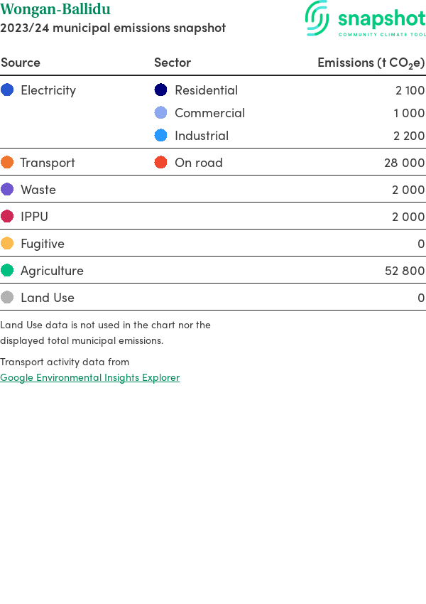 Wongan-Ballidu is a rural municipality that is moderate in size relative to the state average and has a low urban density. Its major emissions source is agriculture, due to the community’s relatively large amount of agricultural activity and low population. The second largest source of emissions is on road transportation.