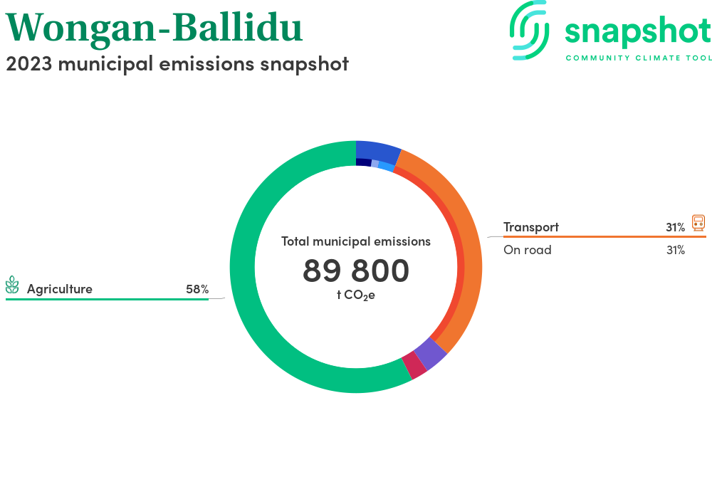 Wongan-Ballidu is a rural municipality that is moderate in size relative to the state average and has a low urban density. Its major emissions source is agriculture, due to the community’s relatively large amount of agricultural activity and low population. The second largest source of emissions is on road transportation.